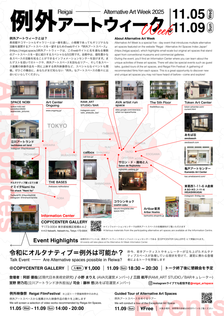 「例外アートウィーク2025」に参加させていただきます。callboxは開催中の今井しほかさんの個展での参加となります。本企画のインフォメーションセンターであるCOPYCENTER GALLERYでは、例外映像祭やオルタナティブをテーマにトークイベントも開催予定です。(映像祭についても今井さんの映像作品にて参加しております。)ぜひお越しください。下記関連サイト–・例外アートスペース・美術手帖